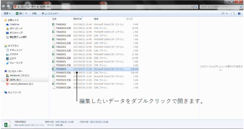 SDカードのフォルダが開いたら、グラフを作成したいデータ(ファイルの種類がMicrosoft Excel csvファイルのもの)をダブルクリックしてください。ファイルが開きます。