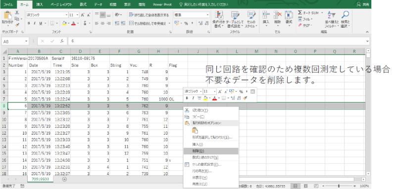 該当する測定データの行を選択し、右クリックをして「削除」を選びます。
