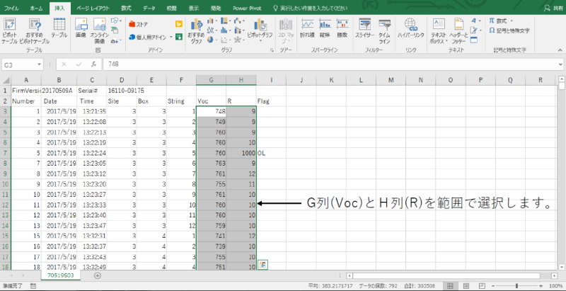測定データのG列(Voc)とH列(R)を範囲で選択します。