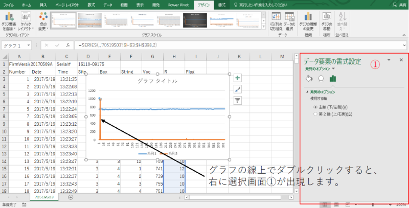 表示されたグラフ内の線をダブルクリックすると、画面右に「データ要素の書式設定」が表示されます。