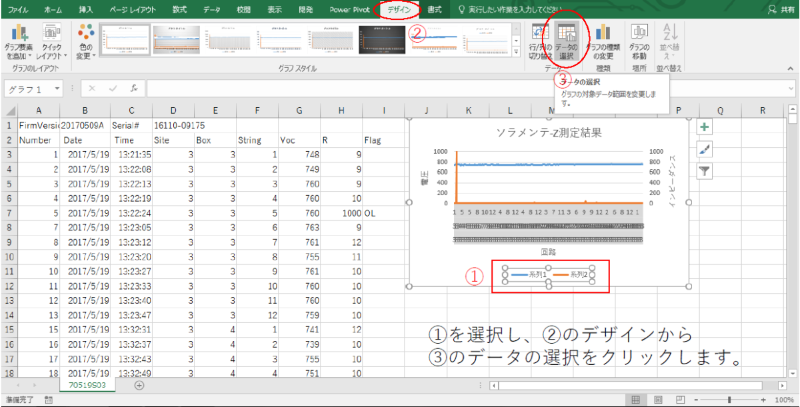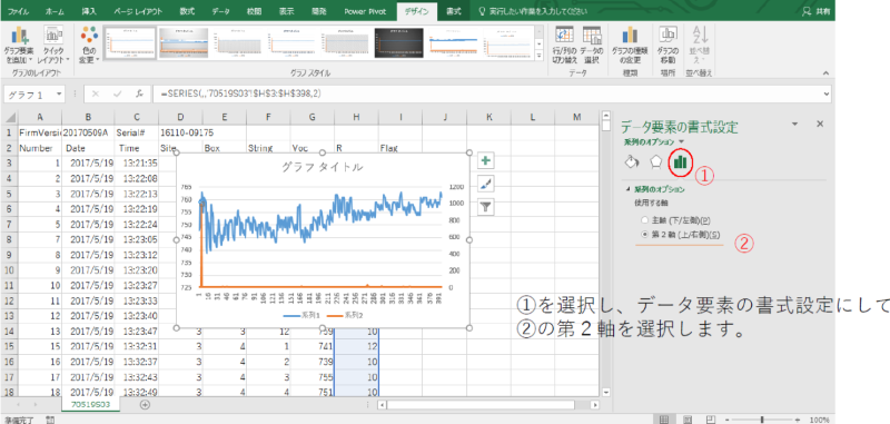 グラフ内下部に表示されている「系列1 系列2」の表示をクリックすると、画面上部のタブが「デザイン」に切り替わるので、サブメニュー内の「データの選択」を選びます。