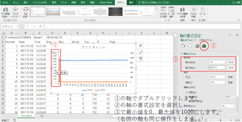 「境界値」が一番上に表示されているので、「最小値」は0、「最大値」を1000に設定します。次に①の反対側にある右側の数字部分もダブルクリックし、こちらも「最大値」を1000に設定します。