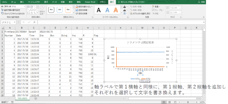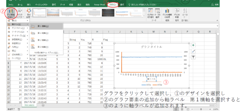 ついでに同じ操作なので、タイトルも追加しておきましょう。「グラフ要素を追加」から「グラフタイトルの追加」→「グラフの上」を選択します。グラフタイトル用のテキストボックスが表示されるので、選択し「ソラメンテ-Z 測定結果」と入力します。これでグラフのタイトルも付追加できました。