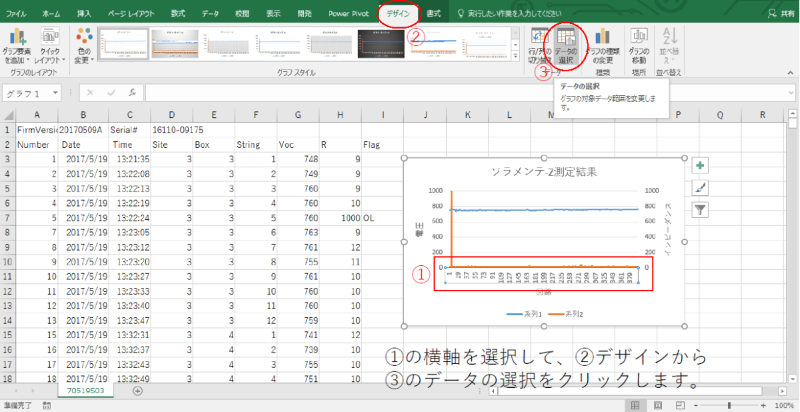 グラフ内の横軸の数字をクリックすると、緑の部分にあるタブが「デザイン」に切り替わります。「デザイン」内にあるサブメニュー「データの選択」をクリックします。