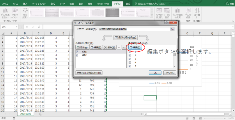 再度「データソースの選択画面」に戻るので、次は(チェックボックスの選択はそのままにして)「系列2」のみを選択し(灰色になります)、「編集」ボタンをクリックします。