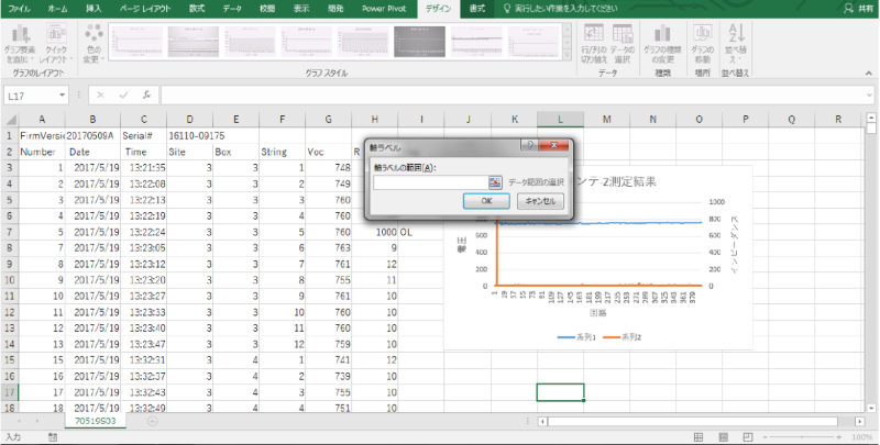 「軸ラベルの範囲」に選択したセルの範囲が反映されます。最後にOKをクリックすると、グラフ内の「回路」に「String」「Box」「Site」の番号が追加されました。