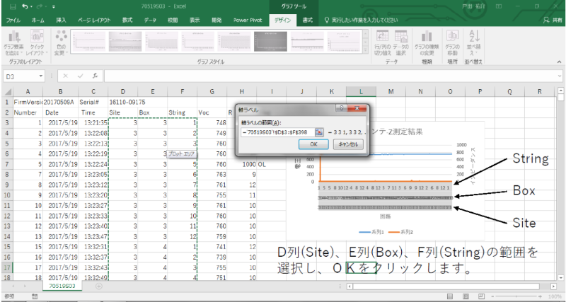 ExcelシートのD列3行目(Site)、E列3行目(Box)、F列3行目(String)から、測定データの最後まで選択します。