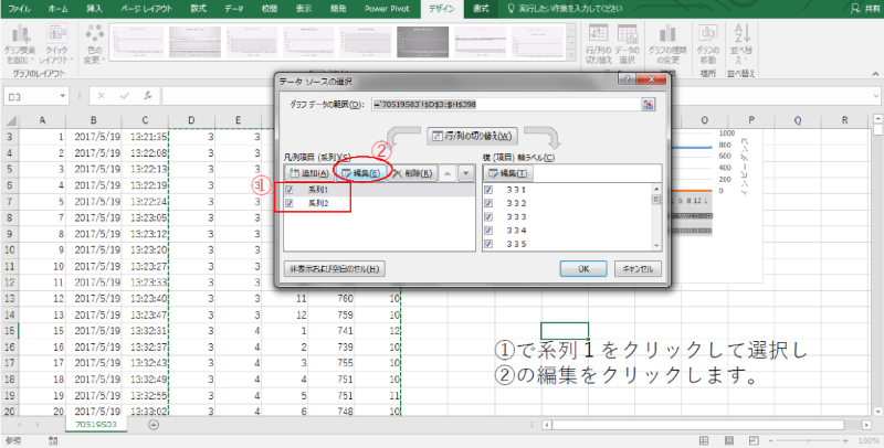 「データソースの選択」ウインドウが表示されます。左側の「凡例項目(系列)」から、(チェックボックスの選択はそのままにして)まずは「系列1」のみを選択し(灰色になります)、「編集」ボタンをクリックします。