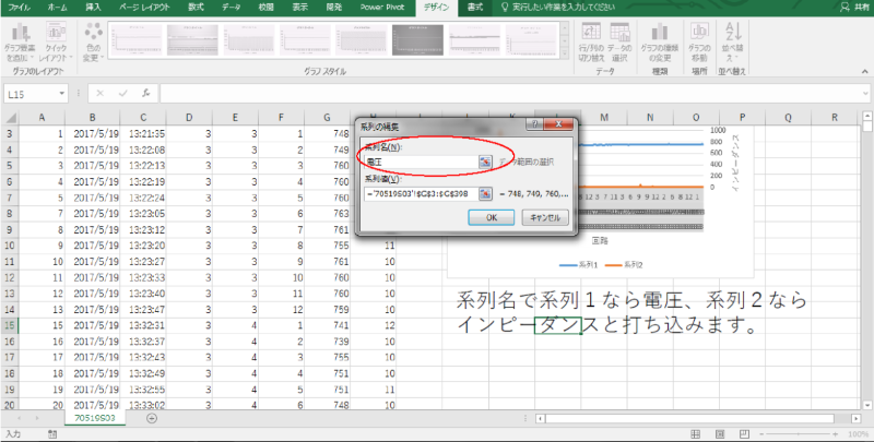 「データソースの編集画面」にまた戻るので、最後に「凡例項目(系列)」の「電圧」と「インピーダンス」のどちらにもチェックを入れます。これで系列名の設定が終わりました。