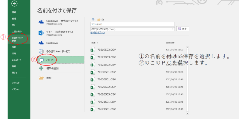 左側のサイドバーにある「名前を付けて保存」を選択します。するとサイドバー横にデータを保存するところの候補が表示されるので、「このPC」をダブルクリックしてください。