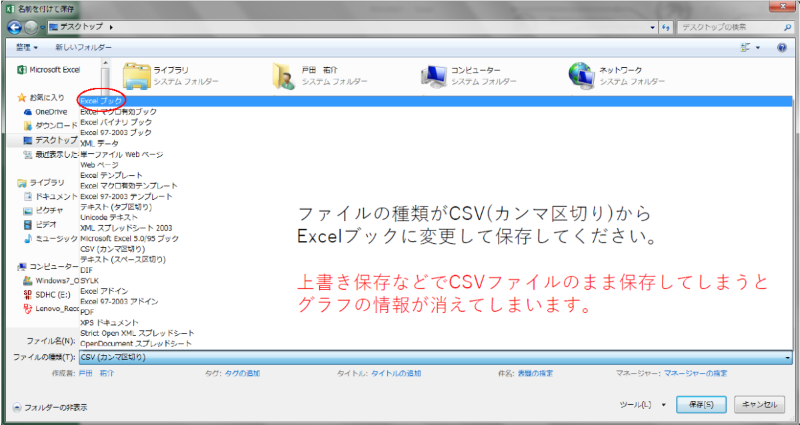 最後にファイルの形式を変更します。現在はソラメンテ-Zから抽出したcsvという形式のファイルを編集していましたが、このまま保存してしまうとせっかくのグラフが消えてしまうので、保存形式をExcelブックに変更します。