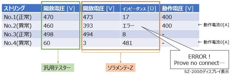 接続箱で、汎用テスター・ソラメンテ-Z・クランプメーターの3つでストリングの点検を行うと、下記のような測定結果が得られました。