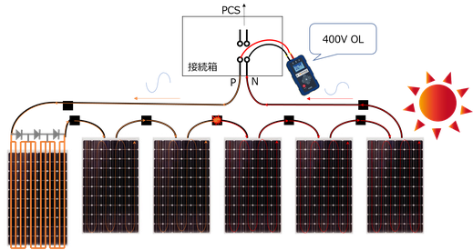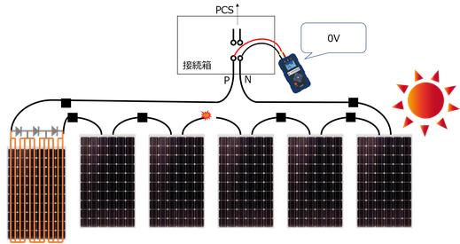故障クラスタ箇所では、バイパスダイオード回路を通るため開放電圧が低下し、高抵抗となります。