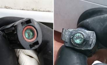 信号の途切れ目にある、PVケーブルのコネクタ部を外して確認したところ、緑青錆びが発生していることが分かりました。