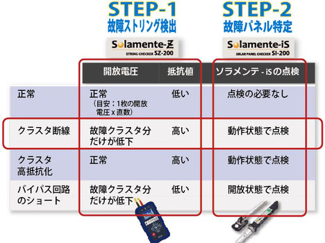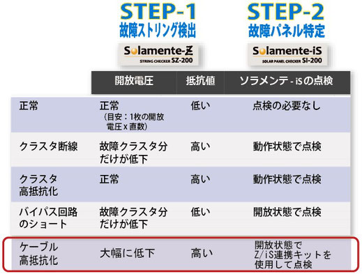 また、従来機(ソラメンテ-Z、ソラメンテ-iS)では、パネル内部で起こっている故障を特定していましたが、Z/iS連携キットを追加することで、パネル~パネル間で起こっている高抵抗も発見することができるようになりました。