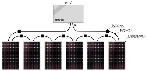 上の図は、太陽光発電システム(接続箱からストリング)の配線イメージです。