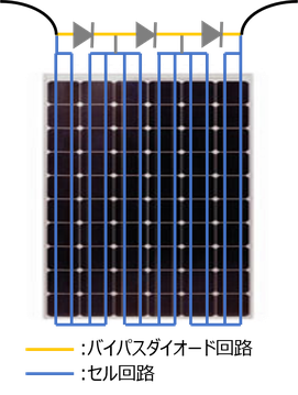 太陽光パネルの内部配線を詳しく見ると、ジャンクションボックス内のバイパスダイオード回路と、太陽電池セルを直列に配線しているセル回路とがあります。